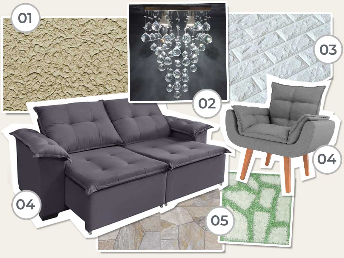 Legenda: (01) Texturas com massa corrida • (02) Lustre de gotas de vidro ou acrílico • (03) Placas de acetato, plástico, espuma ou isopor imitando revestimentos • (04) Mobiliários com design visualmente pesado ou com proporções e acabamentos que comprometem a harmonia do ambiente • (05) Revestimentos que reproduzem paginações ou materiais não convencionais.